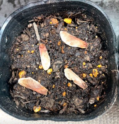 昨年の11月に日帰りで高山に行った時に「もみじの種」を拾って来ました。種を水に浸してビニール袋に入れて冷蔵庫で保管していたのを昨日土に植えました。もみじを育てるのは難しいそうですが、根気よく頑張って育てたいです。まずは発芽してくれるのを楽しみにしています。